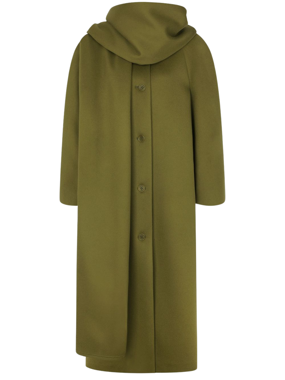 Olive green wool-cashmere blend single-breasted coat with scarf detailing, front button fastening, long sleeves, and a straight hem. Made in Italy, mid-length.