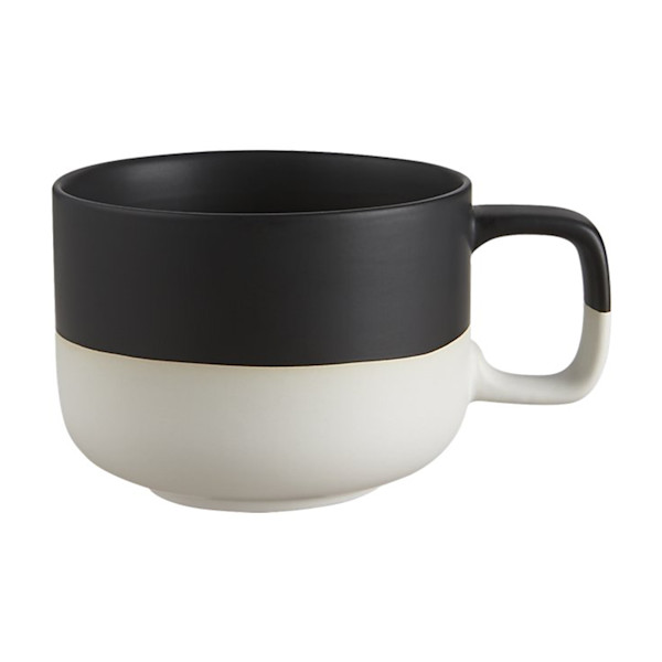 split personality. Two-tone stoneware mug pulls a double. Demi-dipped in matte black glaze, low-profile form with square handle exposes the natural clay base to graphic effect. Sips 14 ounces of coffee/tea, or serves soup/sandwich with matching black dip platter. black dip coffee mug. 4" dia. x 3"h Stoneware Demi black glaze with exposed stoneware base Use as coffee mug or soup bowl 14 oz Dishwasher- and microwave-safe Made in China overall dimensions Height: 3" Diameter: 4"