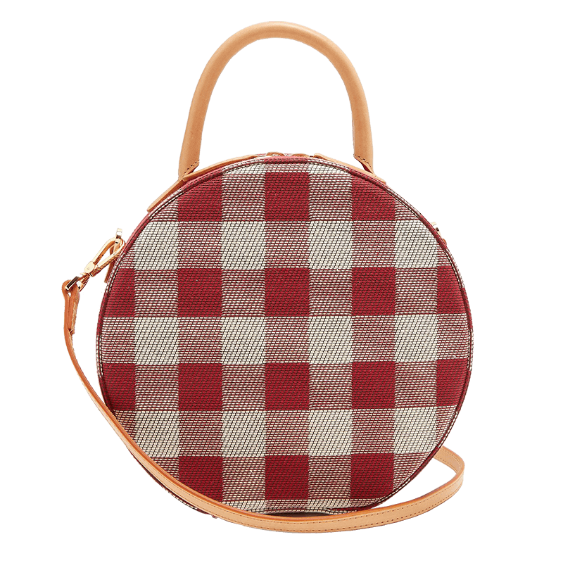 This crossbody circle bag with tan brown rolled-top handles and a detachable shoulder strap comes in red and white gingham for the perfect pop of pattern your summer wardrobe needs. Wear with denim on denim or a pinstripe blazer as a preppy statement piece.