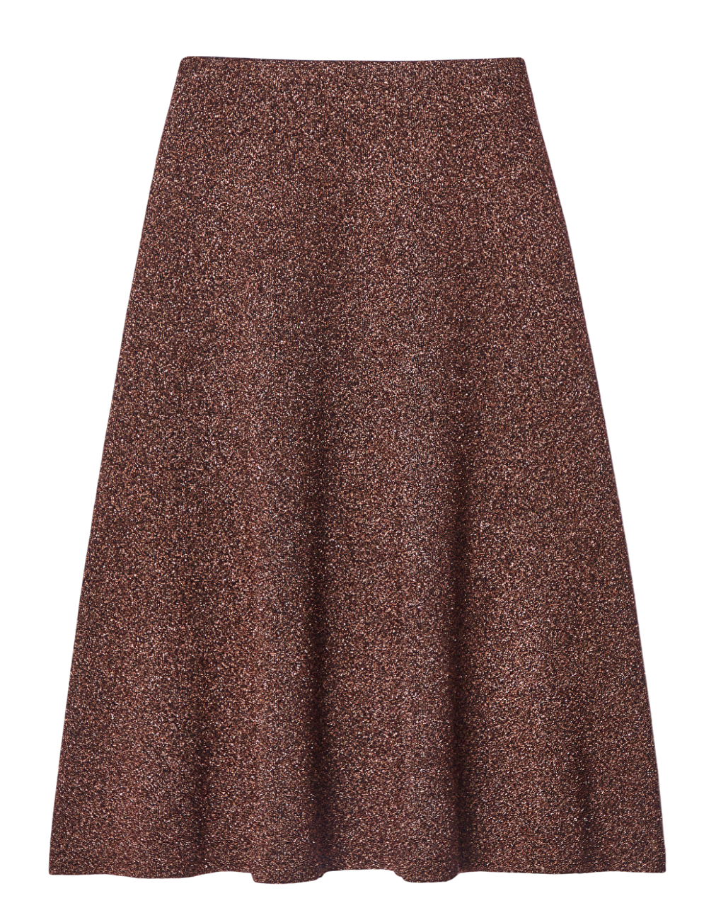 This COS midi skirt is knitted from premium merino wool with metalized fibers that beautifully catch the light. It's double-faced with a soft chocolate-brown interior and cut in a voluminous A-line shape.