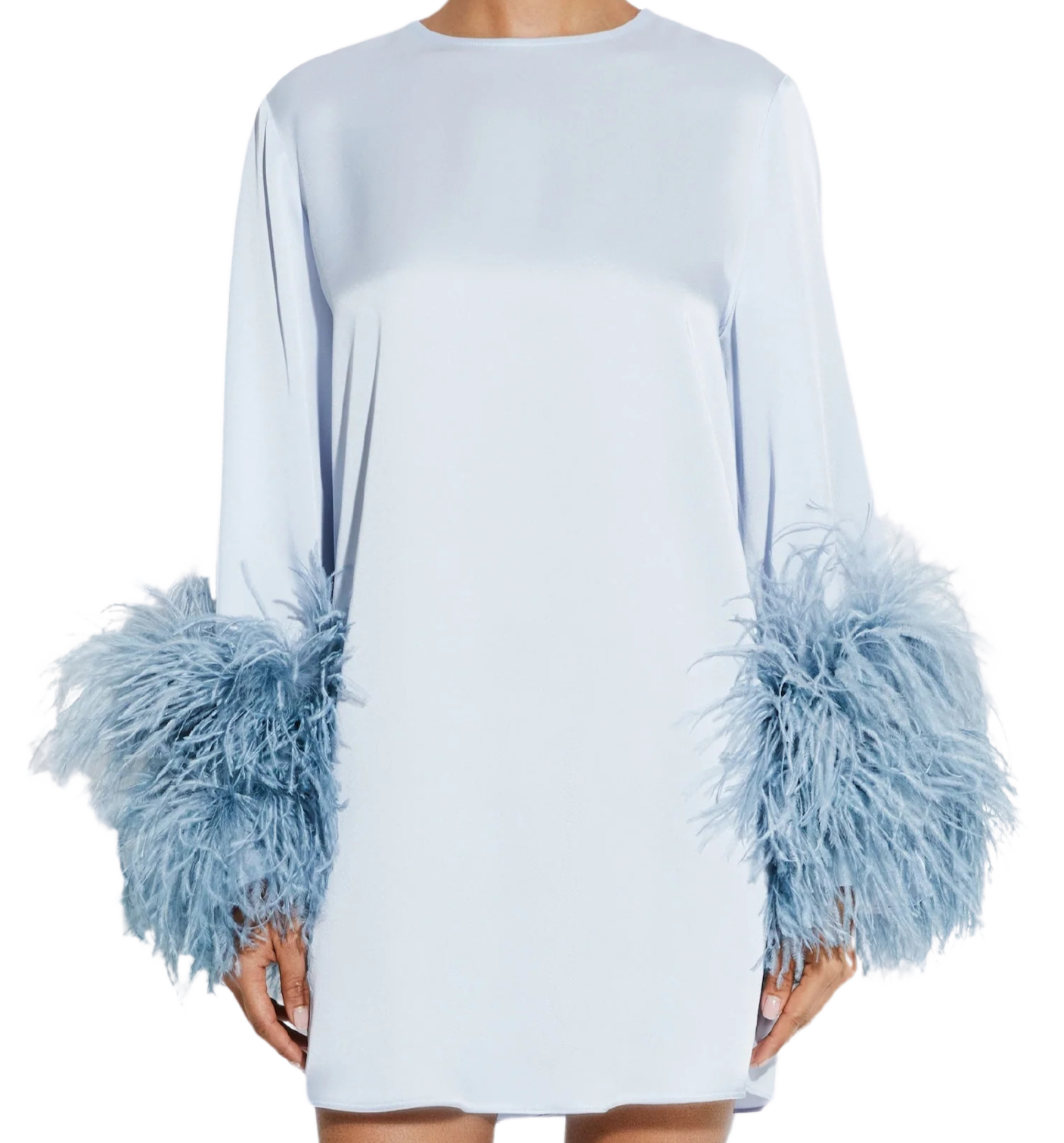 Shift dress in our luxurious doubleface satin fabrication. Features feathers at the wrist.