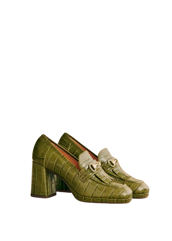 These high-heeled loafers, made in Portugal, feature crocodile-embossed leather, a 8 cm heel, 1 cm platform, and a gold-finished brass buckle.